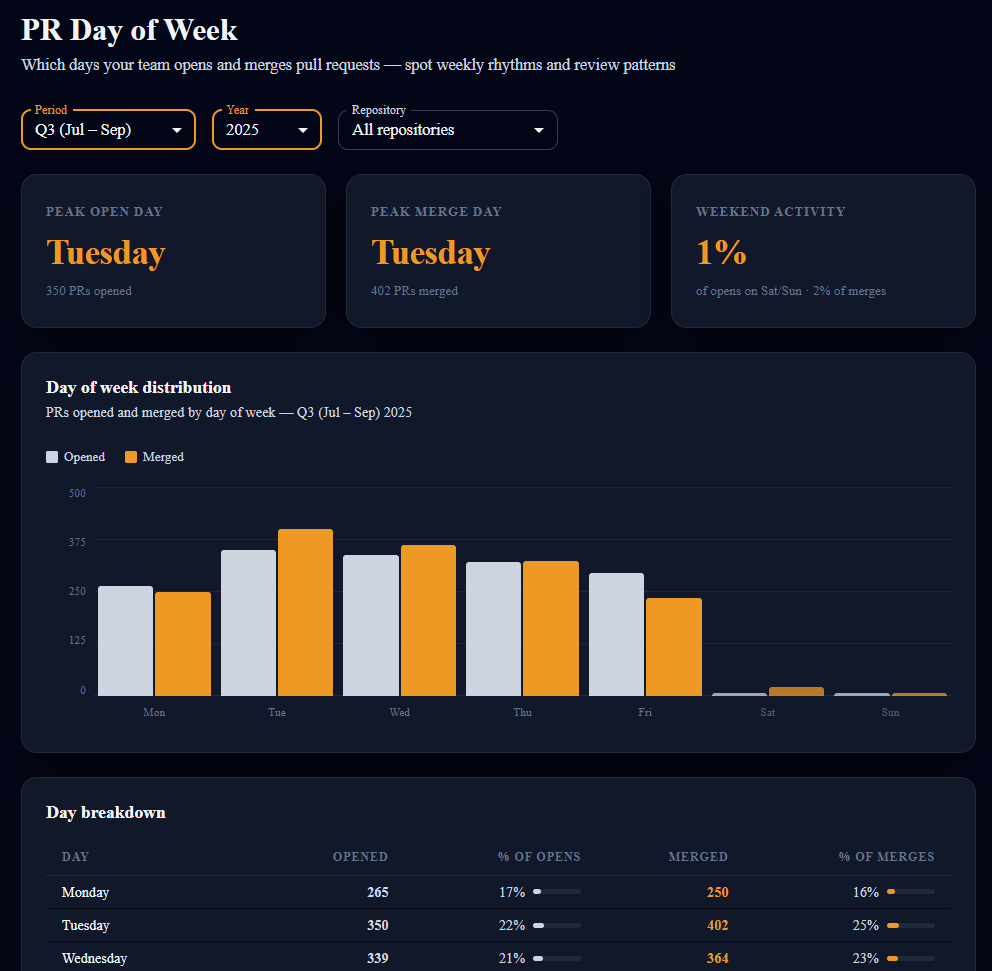 - Days of the week when most pull requests are opened and closed
